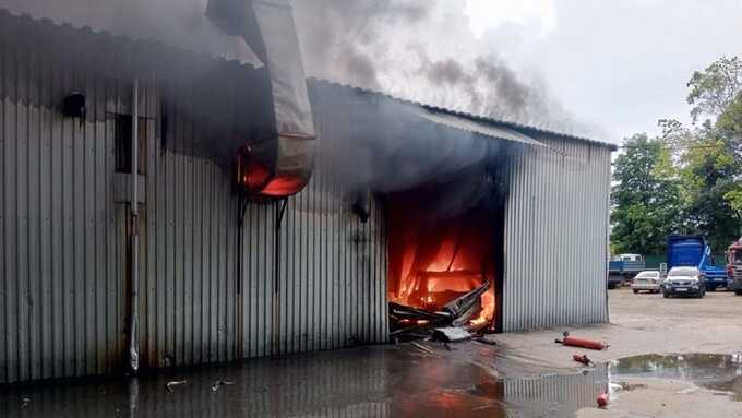 Внутри горящего строения находятся автомобили и баллоны, один из которых взорвался. Площадь пожара - 120 квадратных метров.