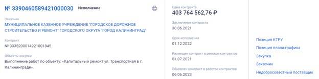 Контракт на ремонт дороги в Калининграде должен был быть сдан в 2022 году, но "Возрождение" не справилось. Фото: https://zakupki.gov.ru