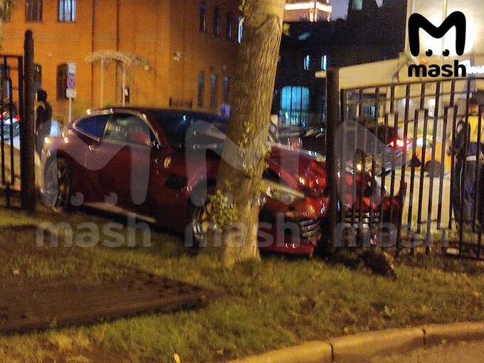 Ferrari врезалась в забор на улице 1905 года в Москве.