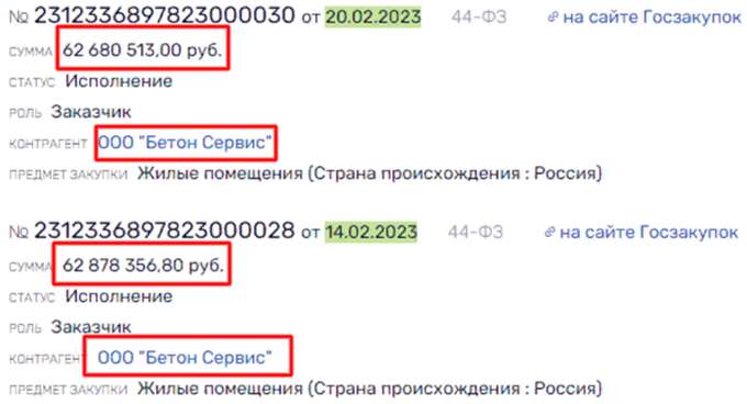 Откат в размере 17 млн руб. предполагает заключение контракта на сумму хотя бы 170 млн руб. Таких в 2023 г. нет. Самый крупный контракт на 62.8 млн руб., заключен 14 февраля с ООО «Бетон Сервис». Предмет закупки – жилые помещения. Какие и сколько не уточняется.