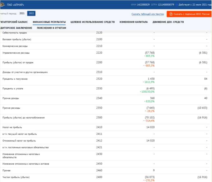 Также кредит "Алмару", судя по отчётной документации, выдавался и в апреле 2022 года. Сумма была 34 млн рублей.
