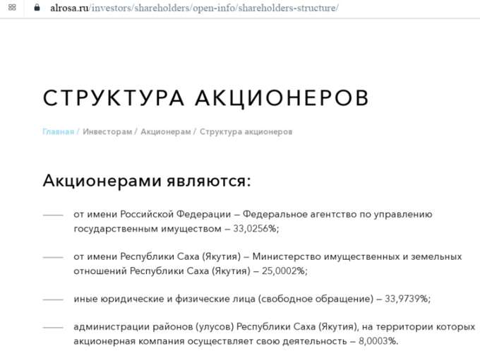 Но ведь и "Алроса" по большей части - это государственный актив. По данным с сайта "Алросы", РФ в компании принадлежит 33,02% акций, Республике Якутии в лице уже знакомого нам министерства - более 25%, улусам Якутии - более 8% и лишь 33,97% во владении частных лиц.
