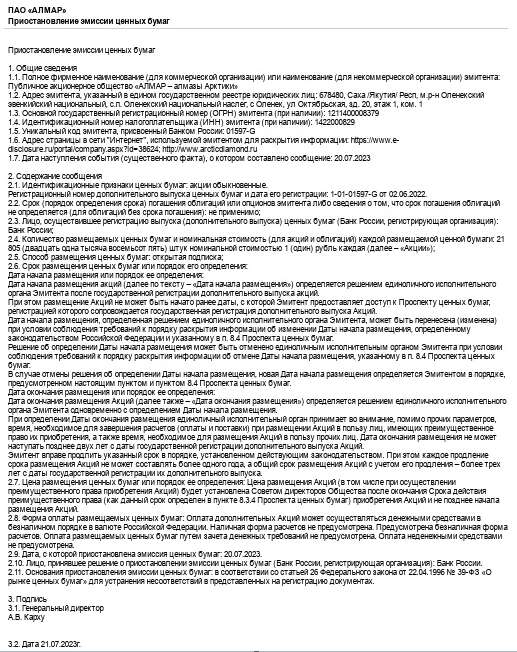 20 июля 2023 года на сайте раскрытия информации появились сведения о том, что ПАО "Алмар – алмазы Арктики" совершило крупную сделку.