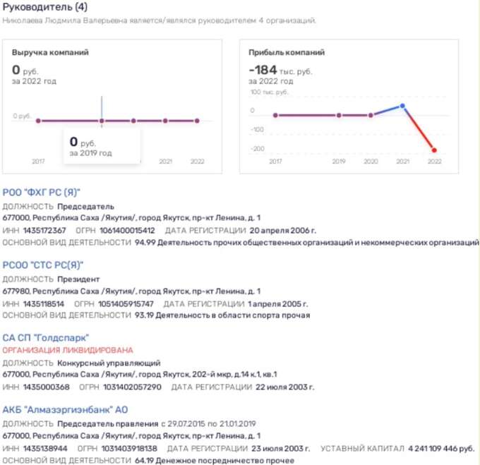 Что касается иных активов Людмилы Николаевой, то она владеет также долями в двух московских компаниях - ООО "Поларктик Капитал" и ООО "УК Восток". Обе в 2022 году демонстрировали убытки.