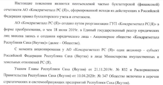 А АО "Комдрагметалл Республики Саха (Якутия)", по данным из отчётности за 2022 год, это бывший ГУП, у которого при акционировании в 2019 году единственным собственником была Республика Якутии, а роль учредителя выполняло всё то же министерство имущественных и земельных отношений региона.