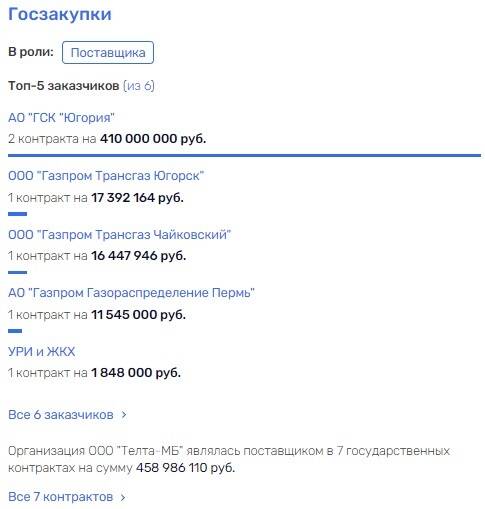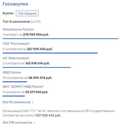 Общий объем госконтрактов "Телты" перевалил за 1 млрд рублей. Ключевой контрагент - российское военное ведомство. На втором месте - крупные госструктуры ПАО "Ростелеком", АО "Воентелеком", российское МВД. При этом завод часто срывал гособоронзаказ, ставя под угрозу обороноспособность страны.