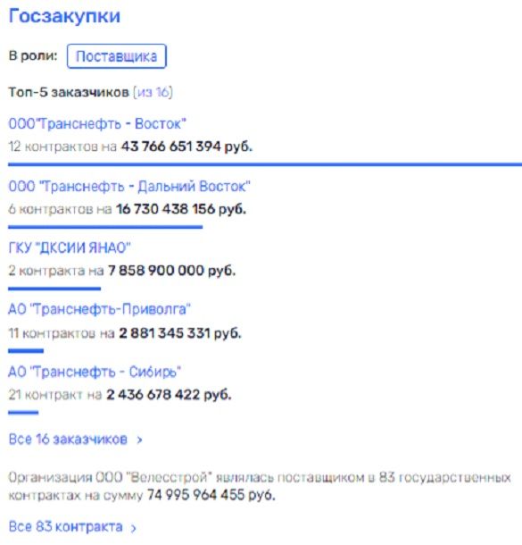На мысли о влиятельных покровителях наводят и госконтракты "Велесстроя", коих набралось уже почти на 75 млрд рублей. И абсолютное большинство - от "Транснефти" Николая Токарева, перед которым разве что такие крупные игроки, как Алексей Миллер, Кирилл Селезнев и Сергей Собянин и могут замолвить слово.