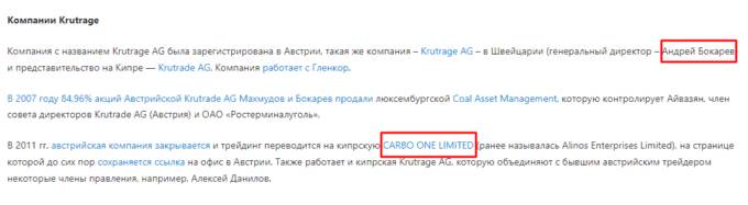 В расследовании предполагалось, что за офшором CARBO ONE LIMITED могут стоять Махмудов и Бокарев, создавшие целую цепочку для выведения денег из «Кузбассразрезугля». При постоянно растущей выручке в сотни миллиардов рублей компания в 2019 г. понесла убыток 406 млн руб., в 2020 г. – 7.8 млрд руб. И почему-то никого такие финансовые показатели компании не удивили.