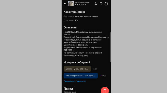 Призер Олимпийских игр продает серебряную медаль на Avito за 4,5 миллиона рублей.