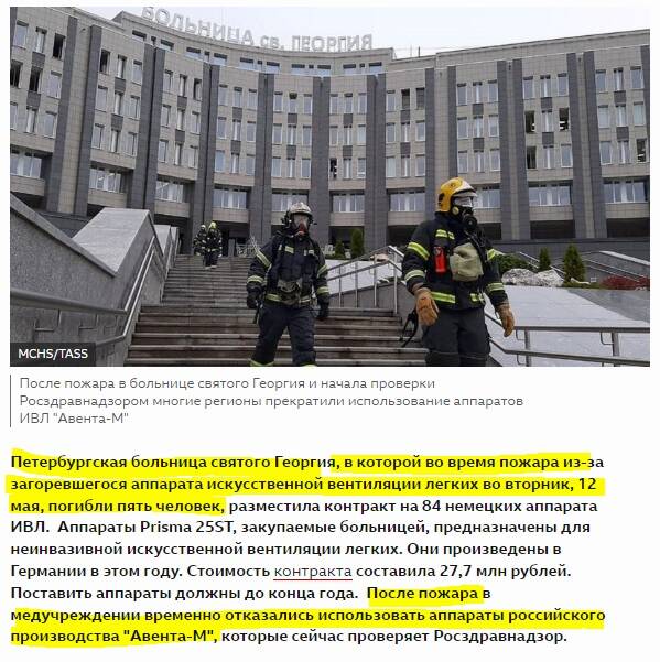 Стоит отметить, что до 2020-го года, а точнее, до начала пандемии, об этом аппарате ИВЛ толком никто и не знал. На рынке такого специализированного оборудования доля «личной разработки Колесова» составляла лишь 2%. Но всё быстро изменилось, когда повалили госзаказы на «Авенту-М» с подачи этого одиозного бизнесмена. Причем, как оказалось, цены на эти аппараты ИВЛ от КРЭТ были явно завышены. Но главная беда даже не в этом. Самое шокирующее во всей этой истории то, что от работы таких горе-аппаратов сгорело несколько больниц, а в огне погибли люди.