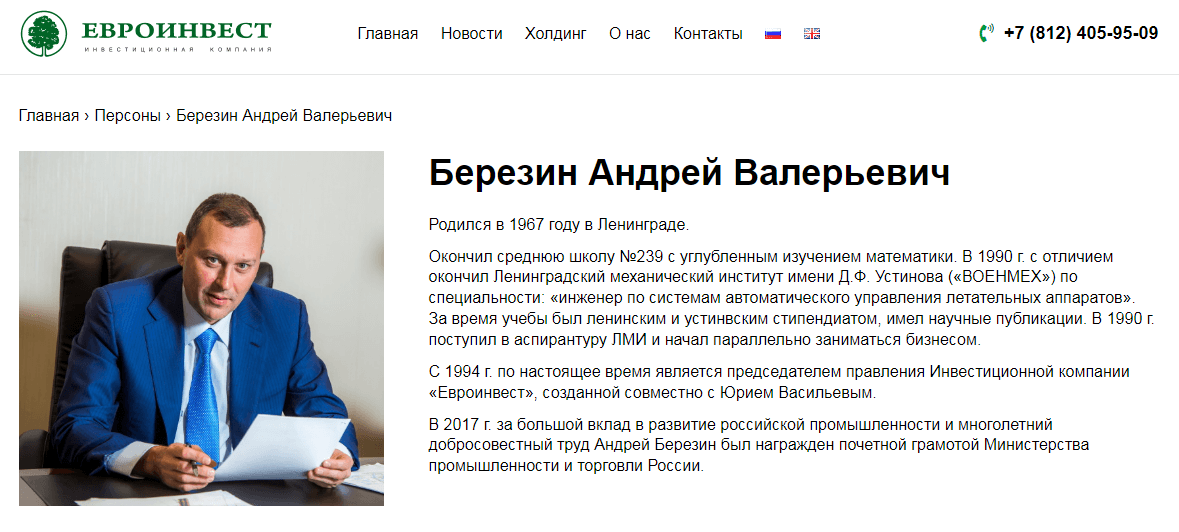 На сайте компании Березину поют мифирамбы. Рассказывают и о награждении его грамотой Минпромышленности и торговли РФ, и о его научных публикациях, и о том, как он был стипендиатом имени известных личностей. А что же на самом деле?