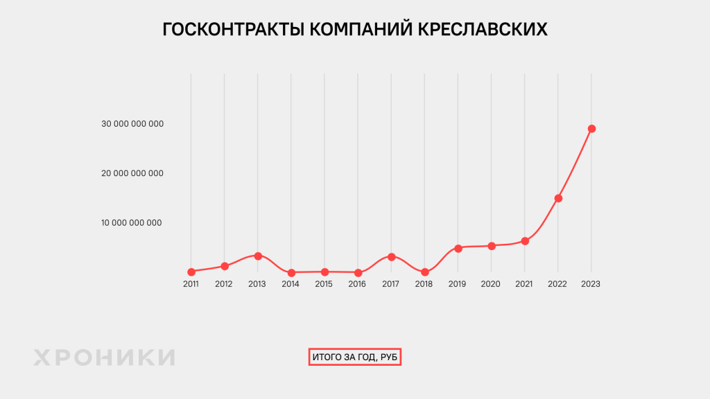 Выручка компаний семьи за 2022 год составила почти 15 млрд руб., прибыль — более 4 млрд руб. Объем госконтрактов компаний за последние три года, которые Креславский возглавляет строительную отрасль Петербурга, вырос почти в шесть раз — с 5,4 млрд рублей до 29 млрд.