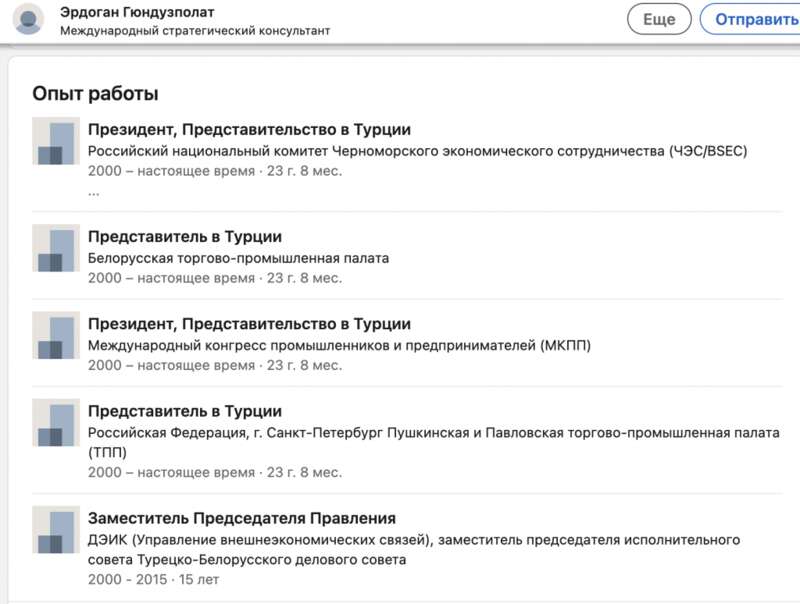 Эрдоган Гундузполат, судя по странице в соцсети Linkedin, возглавляет турецкое представительство «Российского национального комитета по Черноморскому экономическому сотрудничеству», турецкое представительство «Международного конгресса промышленников и предпринимателей», представляет в Турции «Пушкинско-Павловскую торгово-промышленную палату». В общем, имеет крепкие связи с Россией.