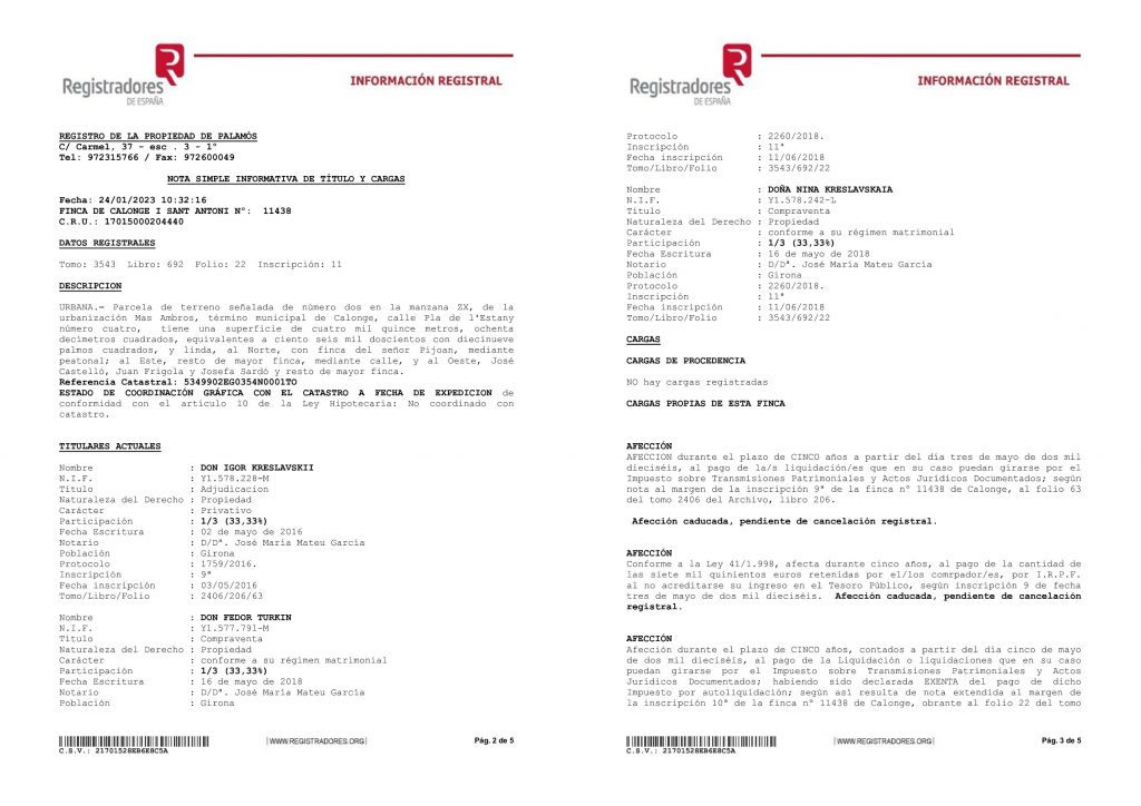 Судя по декларации, у Креславского, кроме этого дома, есть также два участка в Испании. Один — площадью 2 231 кв. м (на нем как раз расположен дом). А вот со вторым участком есть странность. В декларации Креславского указано, что площадь постройки составляет 8 015 кв. м. В испанском реестре написано, что площадь участка, которым Креславский также владеет совместно с матерью и отчимом, составляет чуть больше 4 000 кв. м. А судя по кадастровой карте Испании, площадь этого участка и вовсе 3 420 кв. м.