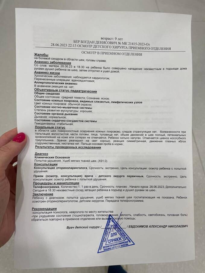 «Он его душил и говорил «Что ты мразь, делаешь». Мой сын просто рыдал, говорил - я не виноват, пока хватало воздуха. Когда Богдан начал хрипеть, мужчина его отпустил, спросил где живут твои друзья и сказал «пусть только попадут ко мне на глаза» и ушел», - рассказывает Алина Колотилова, мама пострадавшего мальчика.