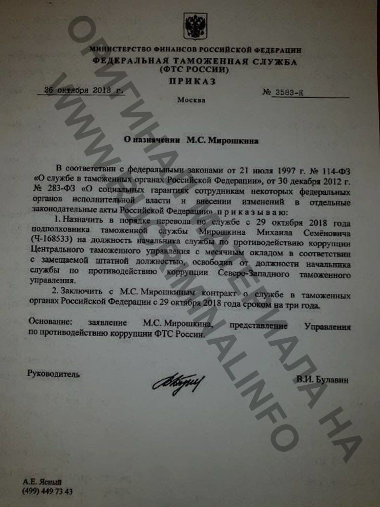 Вернемся к Мирошкину. Свою таможенную карьеру Мирошкин закончил в должности начальника СПК Центрального таможенного управления, куда вопреки его воли перевели под предлогом ротации. Точкой карьеры Мирошкина стало неожиданное заявление на увольнение по собственному желанию, несмотря на только что заключенный служебный контракт на три года. Многие понимают в каких случаях начальники принимают спонтанное решение уйти со службы. Варианты очевидны: выбор пенсия либо в ближайшей перспективе стать фигурантом уголовного дела. Шах и мат.