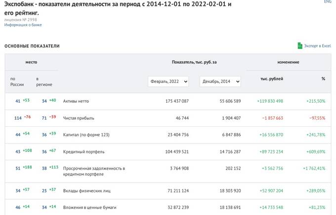 По данным сервиса "Банки.ру", с 2014 по 2022 год "Экспобанк" нарастил на 289,05% объём вкладов физлиц, до 71,2 млрд рублей к февралю 2022 года.