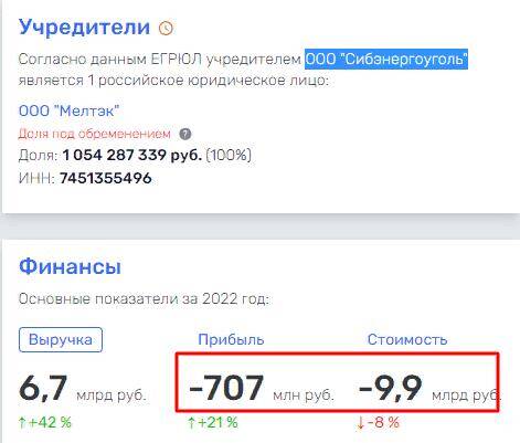 Из дочерних структур ООО «Мелтэк» могут выводиться деньги Газпромбанка. В 2022 г. ООО «Сибэнергоуголь» при выручке 6.7 млрд руб. понесло убыток 707 млн руб., отрицательная стоимость составила 9.9 млрд руб.