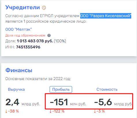 ООО «Энергия-НК» ушло в минус в 2022 г. на 1 млрд руб. при выручке 1.6 млрд руб. Доля «Мелтэка» в этой компании также находится в залоге у Газпромбанка. ООО «Разрез Киселевский» при выручке 2.4 млрд руб. убыток составил 151 млн руб., отрицательная стоимость 5.6 млрд руб.