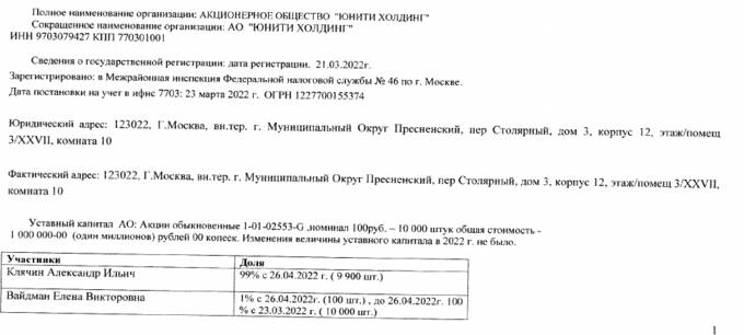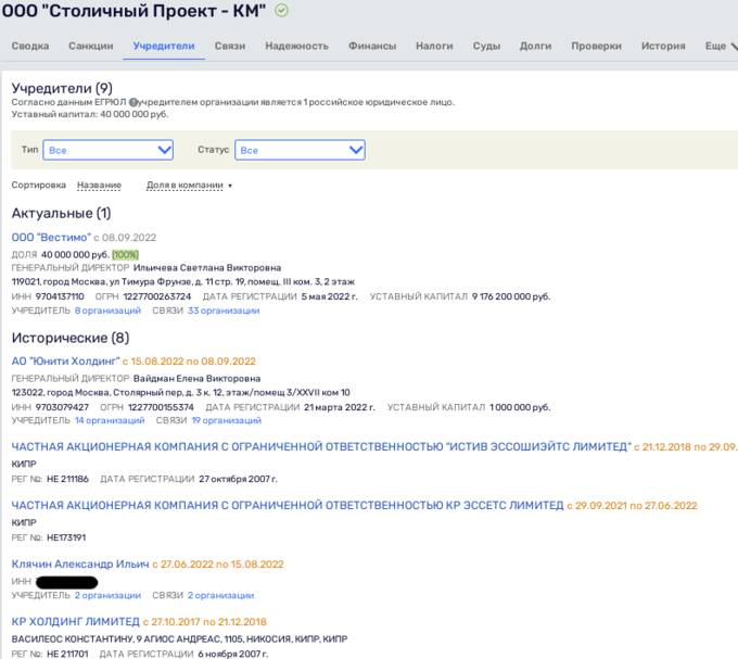 Небольшую долю в АО имеет Елена Вайдман, но основным бенефициаром АО "Юнити Холдинг", судя по отчётности, является Александр Клячин, который, к слову, ранее фигурировал в числе владельцев ООО "Столичный Проект - КМ" лично. При этом в истории владения не обошлось и без офшоров, например, "КР Холдинг лимитед", "Истив Эссошиэйтс Лимитед", "КР Эссетс Лимитед" и VILATORRI TRADING LIMITED.