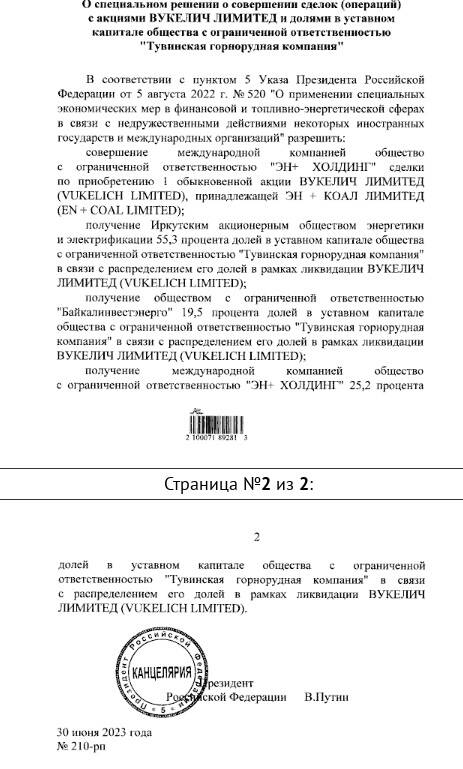 Хотя ещё 30 июня 2023 года вышло распоряжение Президента РФ "О специальном решении о совершении сделок (операций) с акциями ВУКЕЛИЧ ЛИМИТЕД и долями в уставном капитале общества с ограниченной ответственностью "Тувинская горнорудная компания", которым в свете ликвидации офшора разрешили перераспределить доли в ТГРК: покупкой одной акции Vukelich Limited у EN+ Coal Limited международной компанией "Эн+ Холдинг", прописанной в российском "офшоре" Калининграде, а также получением "Иркутскэнерго" 55,3% долей в уставном капитале ТГРК. Ещё 19,5% долей ТГРК получит "Байкалинвестэнерго".