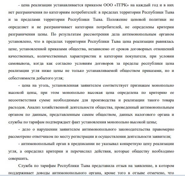 Речь шла о доминирующем положении компании, а также в материалах дела отмечалось, что "цена на уголь, установленная заявителем, соответствует признакам монопольно высокой цены, при этом монопольно высокая цена определена по критерию ее несоответствия сумме необходимым для производства и реализации такого товара расходов". Экие лихие чудеса математики от миллиардеров!