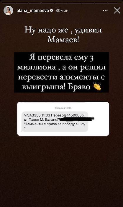 Правда, через некоторое время она поделилась, что Мамаев все-таки перевел ей 1,45 миллиона рублей на алименты