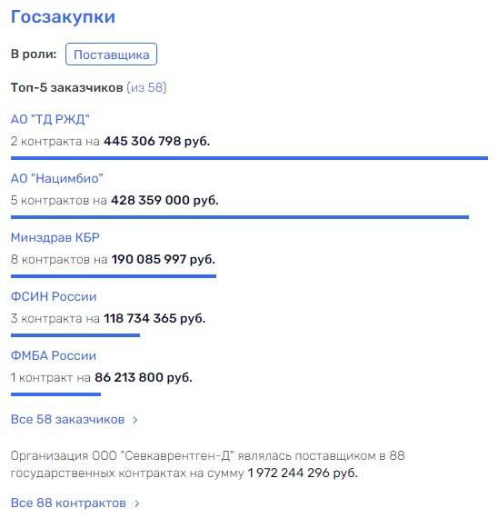 Куда интересней производитель маммографов, которыми торгует Виктория Нефедова. Это ООО "Севкаврентген-Д" из Кабардино-Балкарии с общим объемом госконтрактов уже под 2 млрд рублей. География поставок куда обширней, чем у "Медоптима", а ключевыми контрагентами выступали АО "ТД РЖД" (445 млн), АО "Нацмибио" (428 млн, входит в госкорпорацию "Ростех") и, что показательно, Минздрав КБР (190 млн рублей).