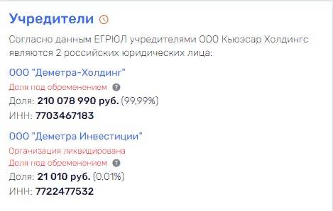 Соучредителями ООО «Деметра Инвестиции» выступали ООО «Деметра-Холдинг» и ООО «Кьюэсар Холдингс», ликвидированное в декабре 2022 г. Ее учредителями были ООО «Деметра-Холдинг» и ООО «Деметра Инвестиции». Их доли в ликвидированной компании до сих пор находятся под обременением ВТБ.