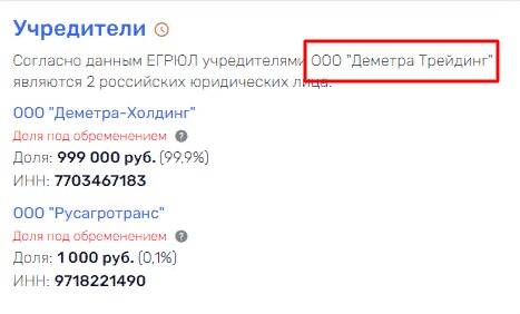 Учредители созданного в 2023 г ООО «Русагротранс» — ООО «Деметра-Холдинг» и ООО «Деметра Трейдинг», чьи доли находятся обременением ВТБ и АО «ЛП Транс». Эта компания до 2021 г. принадлежала РТК РЕЙЛ ТРАНСПОРТС КОМПАНИ ЛИМИТЕД, ранее владевшщая и ликвидированным ООО «РусТрансКом». Его гендиректором и владельцем был Константин Синцов, которого связывали с олигархом Искандером Махмудовым. Синцов может быть тайным акционером «Деметра-Холдинг»?