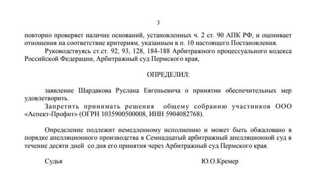 Как писалось выше, видимо, в бумагах Шардаков что-то обнаружил, или что-то ему явно не понравилось. Потому что весной 2023 года – спустя несколько месяцев после прошлого суда, он подал новый иск – уже от своего имени. В нём потребовал признать недействительным протокол общего собрания участников общества от 30.05.2022 и потребовал запретить органам "Аспект-Профит" принимать решения.