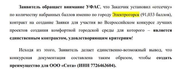 Внимание привлекла в том числе закупка администрации времён Пояркова – на оказание услуг по подготовке заявки на участие во Всероссийском конкурсе лучших проектов создания комфортной городской среды. Администрация почему-то не стала, как это должно, проводить публичные слушания по этому вопросу. А потом выбрала некое ООО Сота" победителем – компания была зарегистрирована в 2020 году и её единственными заказчиками стали (какое совпадение) Администрация городского округа Электрогорск и Администрация Протвино.