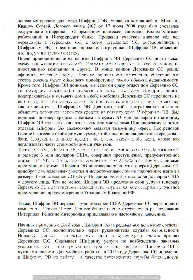 В довершении всего Шифрин написал открытое письмо в Генеральную прокуратуру, где угрожал прокурору и расписывал, как и кому он давал взятки в России. На первом месте тот же Деревянко.