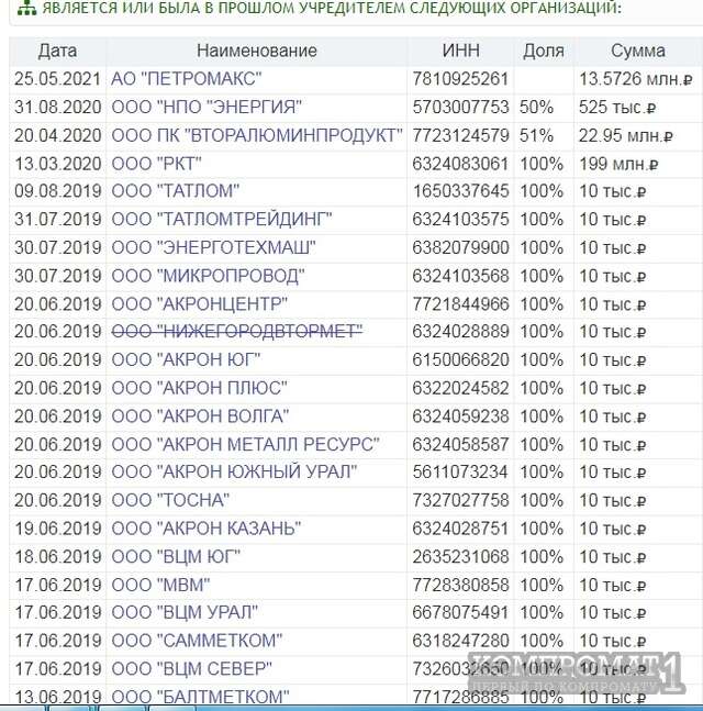 Стоит отметить, что «СамМетКом» c 2016 по 2020 год был объектом проверок надзорных органов как минимум 41 раз, часть проверок были внеплановыми. И, что характерно, его уставной капитал составляет ровно 10 000 рублей, а единственным владельцем является – АО «Акрон холдинг».