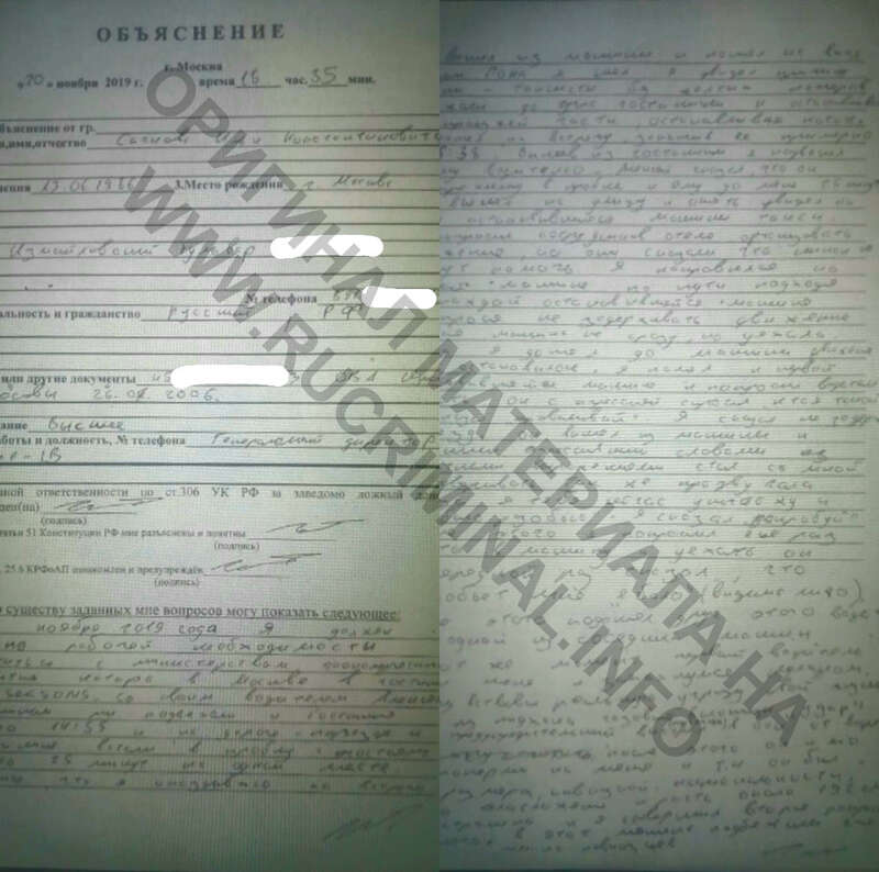 Расшифровка объяснения Сачкова: «20 ноября 2019 года я должен был по рабочей необходимости встретиться с министерством экономического развития (не разборчиво) в гостинице Four Seasons. С моим водителем Алексеем Ереминым мы подъехали к гостинице около 14:55 и … (не разборчиво) встали в пробку около 25 минут (стояли) на одном месте. Учитывая, что я опаздываю на встречу, я вышел из машины и пошёл ко входу в гостиницу. Пока я шёл, я увидел, (не разборчиво), что таксисты не доезжая до гостиницы останавливались на проезжей части, останавливая поток. Я пошёл на встречу, закончив примерно в 16:38, вышел из гостиницы,и позвонил своему водителю. Алексей сказал, что он по прежнему в пробке и ему до меня 25 минут. Я вышел на улицу и опять увидел на углу остановившиеся машины такси. Я попросил сотрудников отеля организовать движение, но они сказали, что ничем не могут помочь. Я направился к своей машине и на пути, подходя к остановившейся машине (не разборчиво) попросил не задерживать движение. Пусть не сразу, но машина уехала. Когда я дошёл до машины, движение опять остановилось. Я подошёл к первой остановившейся машине и попросил водителя уехать. Он с агрессией сказал «кто я такой» и «проваливай». Я сказал, не задерживай проезд. Он вышел из машины и разными агрессивными словами (не разборчиво) стал со мной разговаривать. Также прозвучала фраза «я тебя сейчас уничтожу и ебало разобью». Я сказал «попробуй». После этого я ещё раз попросил сесть в машину и уехать, он в очередной раз сказал, что «разобьёт мне ебало», (видимо лицо». После этого подошёл друг этого водителя из одной из соседних машин и в этот же момент первый Водитель (не разборчиво) и замахнулся кулаком. Я воспринял это как угрозу своей жизни, достал из сумки газовый баллончик «удар» и сделал предупредительный выстрел в бок от водителя. После этого он и его друг поперли на меня, и т.к. он был большого размера, кавказской национальности (не разборчиво) и ростом около 192 см, мне стало страшно и я совершил второе распыление в него. В этот момент подошли ещё несколько кавказцев, примерно 5+-человек, в этот же момент подошёл сотрудник полиции, который попытался успокоить нападавшего и подбежавших. 20.11.2019. И.И. Сачков. Подпись. Хочу дополнить, что весь конфликт и нападение на меня зафиксировали камеры наблюдения, установленные на гостинице. Подпись. Конец.