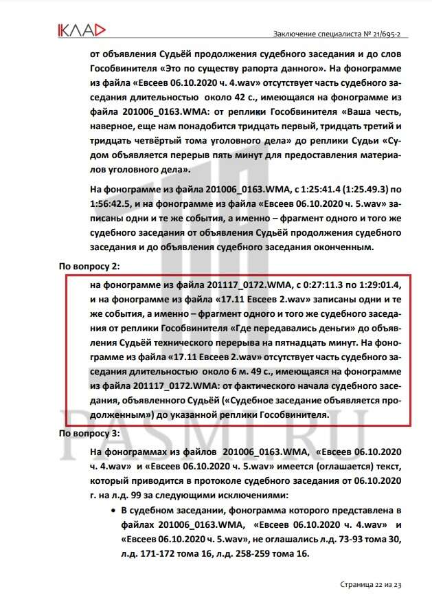 А на записях, выполненных в Ленинском суде, согласно выводам криминалистической лаборатории, признаки монтажа имеются. Эксперты обнаружили, что в фонограммах, выполненных в октябре и ноябре 2020 года отсутствуют несколько отрывков продолжительностью до 7 минут.