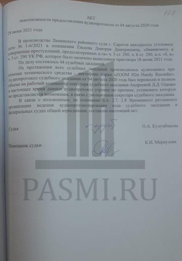 “Аудиопротокол судебного заседания от 4 августа 2020 года был перенесен в полном объеме на рабочий компьютер секретаря Андреевой Д.Д. Однако, в настоящее время данный протокол утрачен по причине, установить которую не представляется возможным, в связи с увольнением секретаря судебного заседания”, — указано в акте.