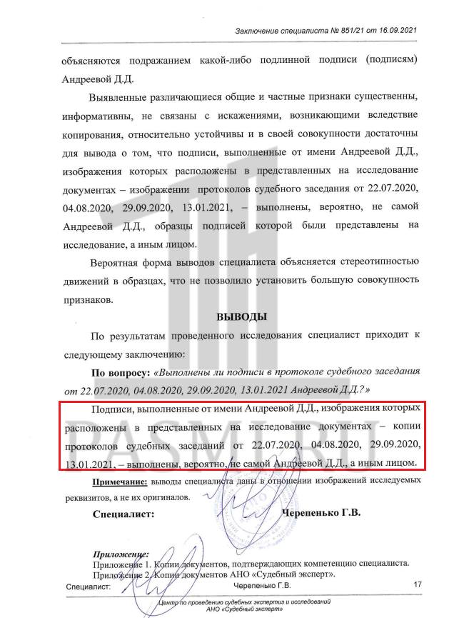 Усомнившись в подлинности этих подписей, защита Дмитрия Евсеева обратилась в Центр по проведению судебных экспертиз и исследований АНО “Судебный эксперт”. По результатам почерковедческого исследования специалист Георгий Черепенько пришел к выводу, что подписи в протоколе судебного заседания, вероятно, выполнены не Андреевой, а другим лицом.