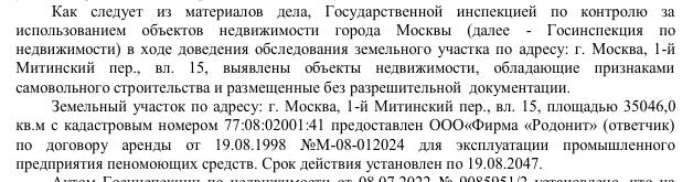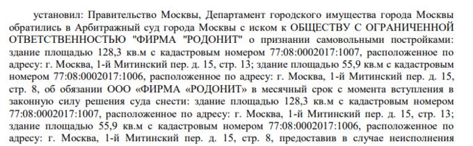 А тут всё просто: исходя из базы арбитража, "Родонит" имеет на балансе крупный арендуемый участок в 1-м Митинском пер. вл. 15. Вот только правительство Москвы обнаружило на нём целых два самостроя, которые и потребовало снести. В первой инстанции власти иск проиграли, дело слушается в кассации. Заседание назначено на 29 января.