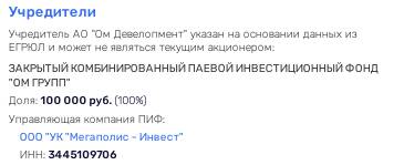 Официально же АО "ОМ-Девелопмент", прикупившее через "дочку" "Родонит" (доля заложена Сбербанку), скрывает бенефициаров за ЗПИФ "ОМ Групп", которым управляет ООО "УК "Мегаполис - Инвест", подконтрольное некоему Роману Соколову (совладелец ряда фирм, работающих в сфере электромонтажа).