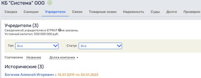 Банк, который называют в качестве возможной покупки группы "Самолёт", - ООО "КБ "Система" до 30 января 2023 года числился за Алексеем Богачевым, который также является совладельцем сети магазинов "Магнит".