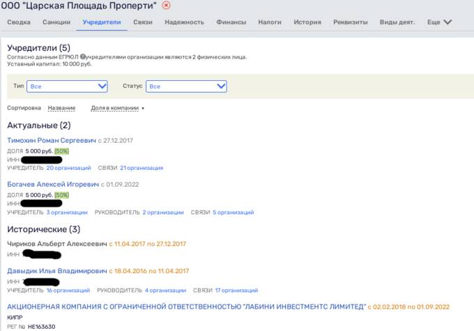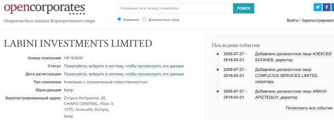 Среди совладельцев вышеупомянутого ООО "Царская Площадь Проперти" в период с 2018 по сентябрь 2022 года фигурировала кипрская фирма "Лабини Инвестментс Лимитед", а газета "Коммерсант" уточняла, что Labini Investments Ltd. - это компания Алексея Богачева, что впрочем подтверждают и открытые базы.