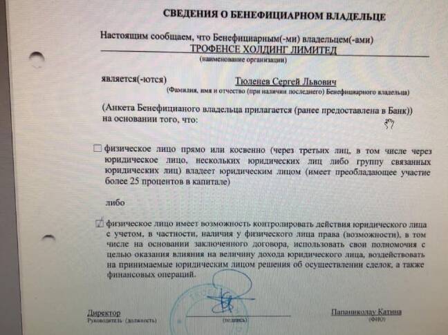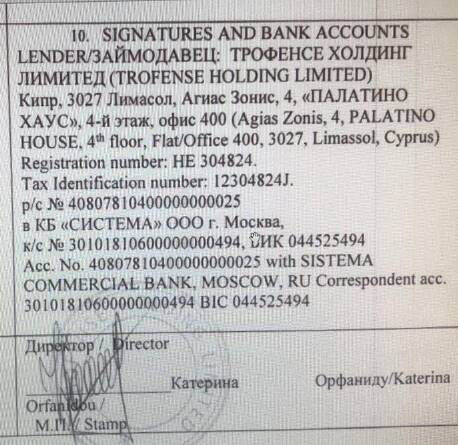 Вот и компания Trofense Holding Limited, по информации Тюленева, оказалась, помимо его воли, записана на него с 2017 года (как на бенефициарного владельца). Директором в ней числилась известная по делу FESCO и участию в нём миллионера Северилова Катина Папаниколау. Собственно именно директор, судя по документам, и указал бенефициаром Тюленева. Вероятно, это сделано, чтобы скрыть реальных владельцев, о которых речь пойдёт далее.