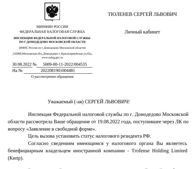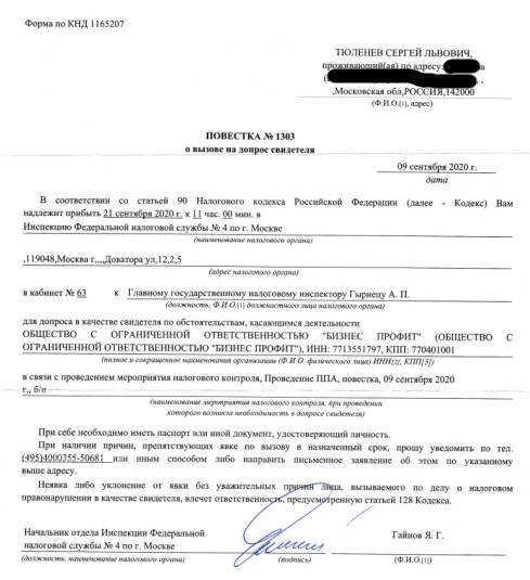 В итоге именно Тюленева, а не реального бенефициара налоговики позднее и вызвали на допрос в связи с выводом, якобы принадлежащих ему денег с продажи земельного участка в Московской области.