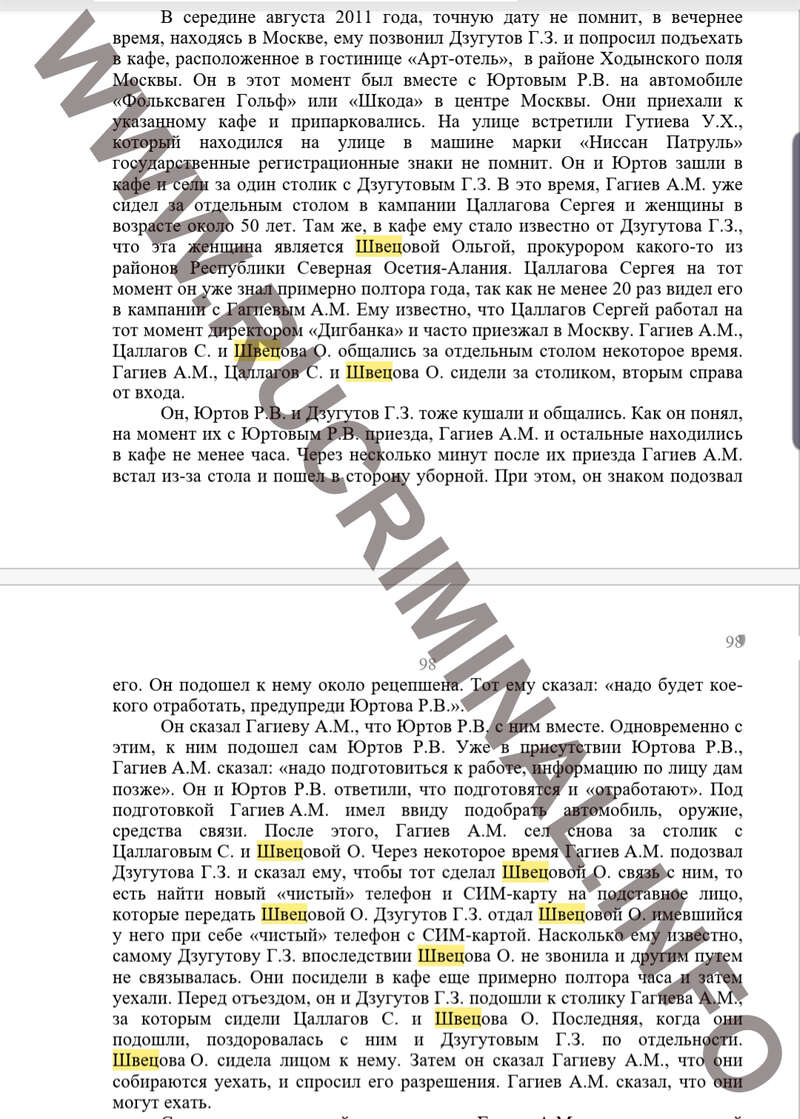 Он сказал Гагиеву А.М., что Юртов Р.В. с ним вместе. Одновременно с этим, к ним подошел сам Юртов Р.В. Уже в присутствии Юртова Р.В., Гагиев А.М. сказал: «надо подготовиться к работе, информацию по лицу дам позже». Он и Юртов Р.В. ответили, что подготовятся и «отработают». Под подготовкой Гагиев А.М. имел ввиду подобрать автомобиль, оружие, средства связи. После этого, Гагиев А.М. сел снова за столик с Цаллаговым С. и Швецовой О. Через некоторое время Гагиев А.М. подозвал Дзугутова Г.З. и сказал ему, чтобы тот сделал Швецовой О. связь с ним, то есть найти новый «чистый» телефон и СИМ-карту на подставное лицо, которые передать Швецовой О. Дзугутов Г.З. отдал Швецовой О. имевшийся у него при себе «чистый» телефон с СИМ-картой. Насколько ему известно, самому Дзугутову Г.З. впоследствии Швецова О. не звонила и другим путем не связывалась. Они посидели в кафе еще примерно полтора часа и затем уехали. Перед отъездом, он и Дзугутов Г.З. подошли к столику Гагиева А.М., за которым сидели Цаллагов С. и Швецова О. Последняя, когда они подошли, поздоровалась с ним и Дзугутовым Г.З. по отдельности. Швецова О. сидела лицом к нему. Затем он сказал Гагиеву А.М., что они собираются уехать, и спросил его разрешения. Гагиев А.М. сказал, что они могут ехать», -говорится в показаниях, с которыми Rucriminal.info знакомит читателей.