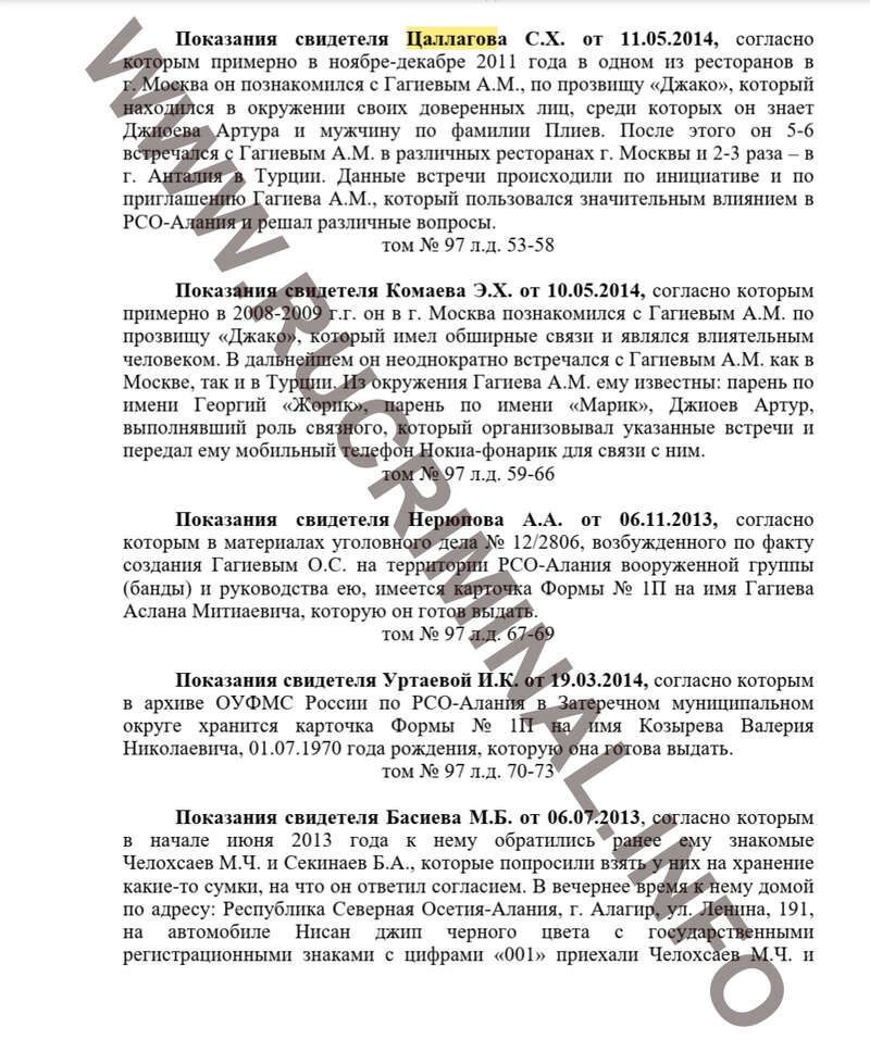В нашем распоряжении оказался протокол допроса Цаллагова, вот, что в 2014 году он сказал следователям: «Показания свидетеля Цаллагова С.Х. от 11.05.2 014, согласно которым примерно в ноябре-декабре 2011 года в одном из ресторанов в г. Москва он познакомился с Гагиевым А.М., по прозвищу «Джако», который находился в окружении своих доверенных лиц, среди которых он знает Джиоева Артура и мужчину по фамилии Плиев. После этого он 5-6 встречался с Гагиевым А.М. в различных ресторанах г. Москвы и 2-3 раза – в г. Анталия в Турции. Данные встречи происходили по инициативе и по приглашению Гагиева А.М., который пользовался значительным влиянием в РСО-Алания и решал различные вопросы».