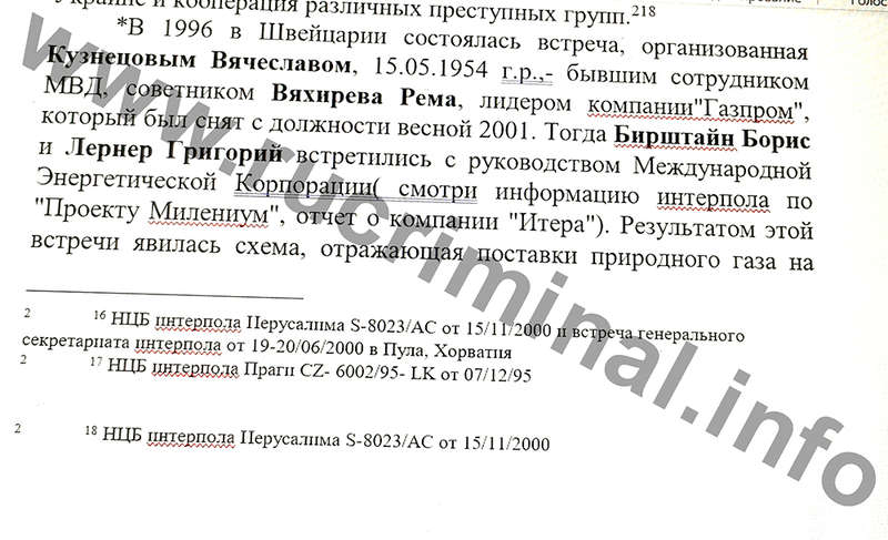Однако, только этим подобное сотрудничество не ограничилось. Согласно данным Интерпола, которые есть в распоряжении rucriminal.info, в 1996 в Швейцарии состоялась встреча, в которой принимали участие Могилевич, Кузнецов, теневой делец Бирштейн и еще несколько человек. На ней и были разработаны схемы по поставке российского и туркменского природного газа на Украину.