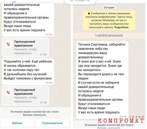Преступники требуют одного – чтобы защитник вышла из дела, бросила на произвол судьбы свою клиентку, и вообще забыла об этой истории, и как мы видим угрожают даже дочери защитника.