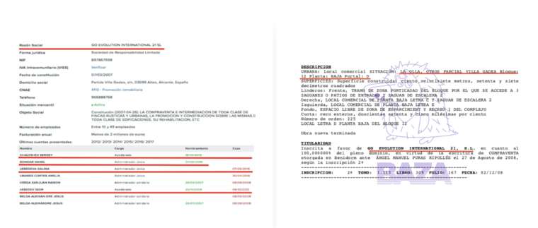 Согласно коммерческому реестру Испании, в 2007 году в Альтее была зарегистрирована компания по управлению недвижимостью Go Evolution International 21 SL . Её уставный капитал в 2012-м составлял 2,8 млн евро, а активы оценивались в 4,5 млн евро. На эту компанию оформлены апартаменты площадью в 133 квадрата в элитном жилом комплексе Villa Gadea почти на самом побережье Средиземного моря. В среднем квартиры с таким метражом в этом комплексе стоят порядка 400 тысяч евро.