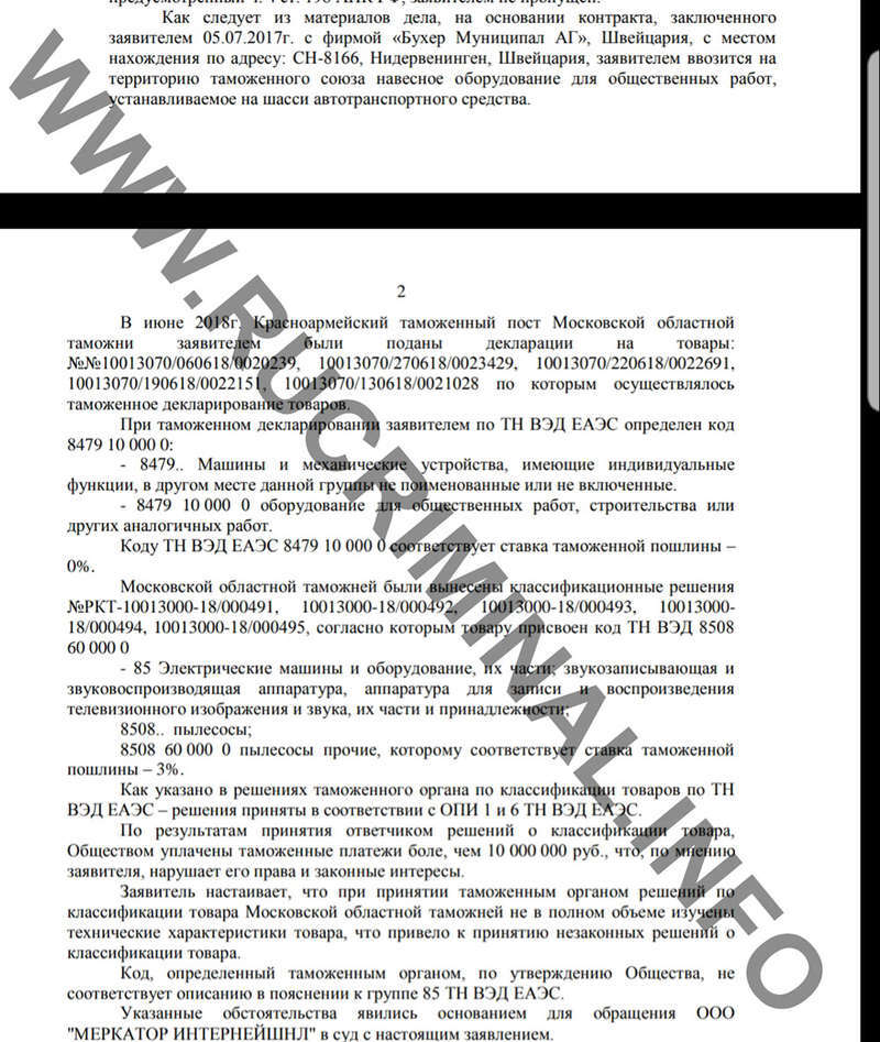 Учитывая, что «Холдинг Меркатор» фактически является российским представительством «Бухер Муниципал АГ», то там не могли не знать, что им идут пылесосы. Но решили оформить их, как другую продукцию, со ставкой таможенных пошлин 0 %. Более того, «Меркатор», будучи пойманным «за руку», решил оспорить действия таможенников в суде, но все иски проиграл.